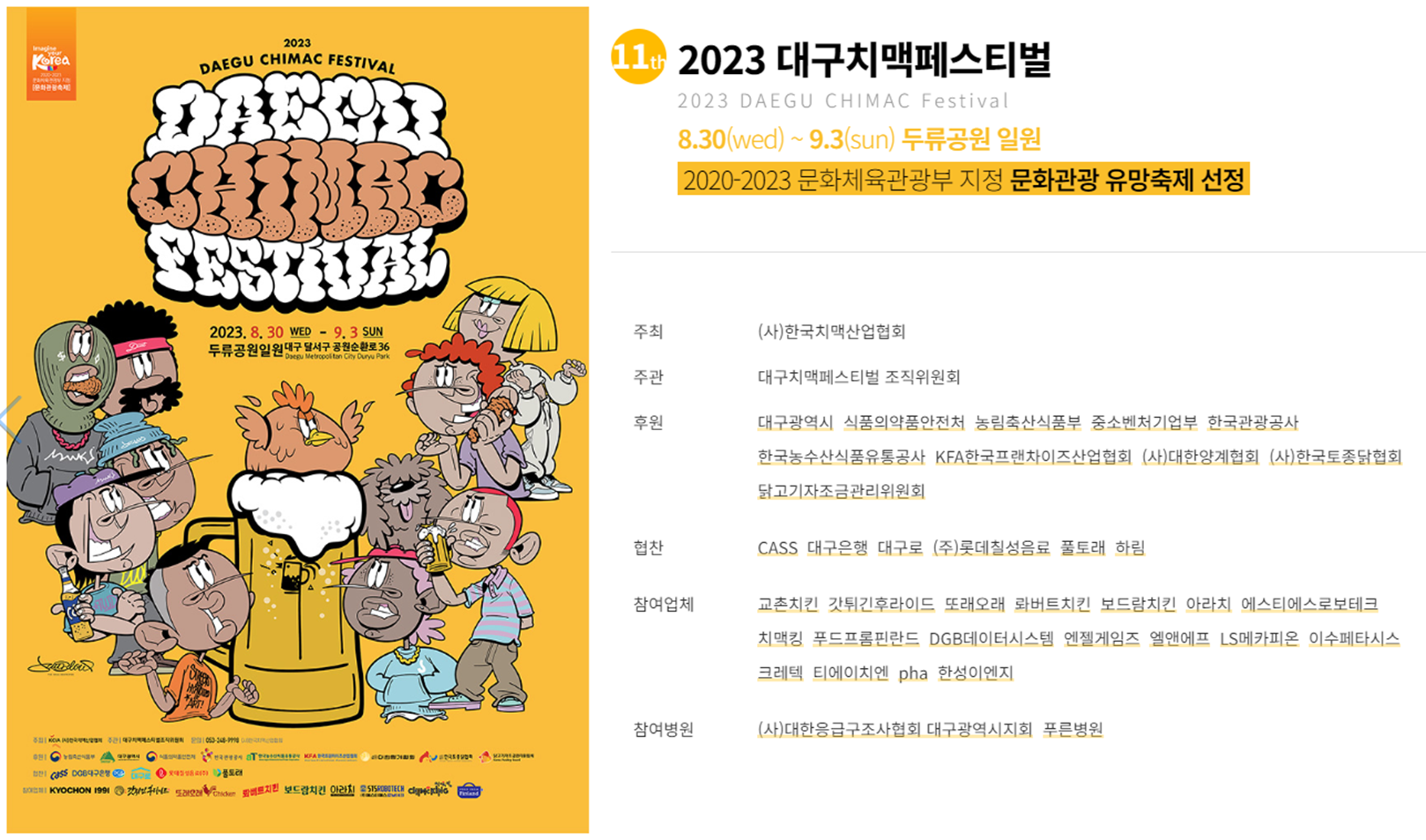 - 주최/주관: (사)한국치맥산업협회 / 대구치맥페스티벌 조직위원회