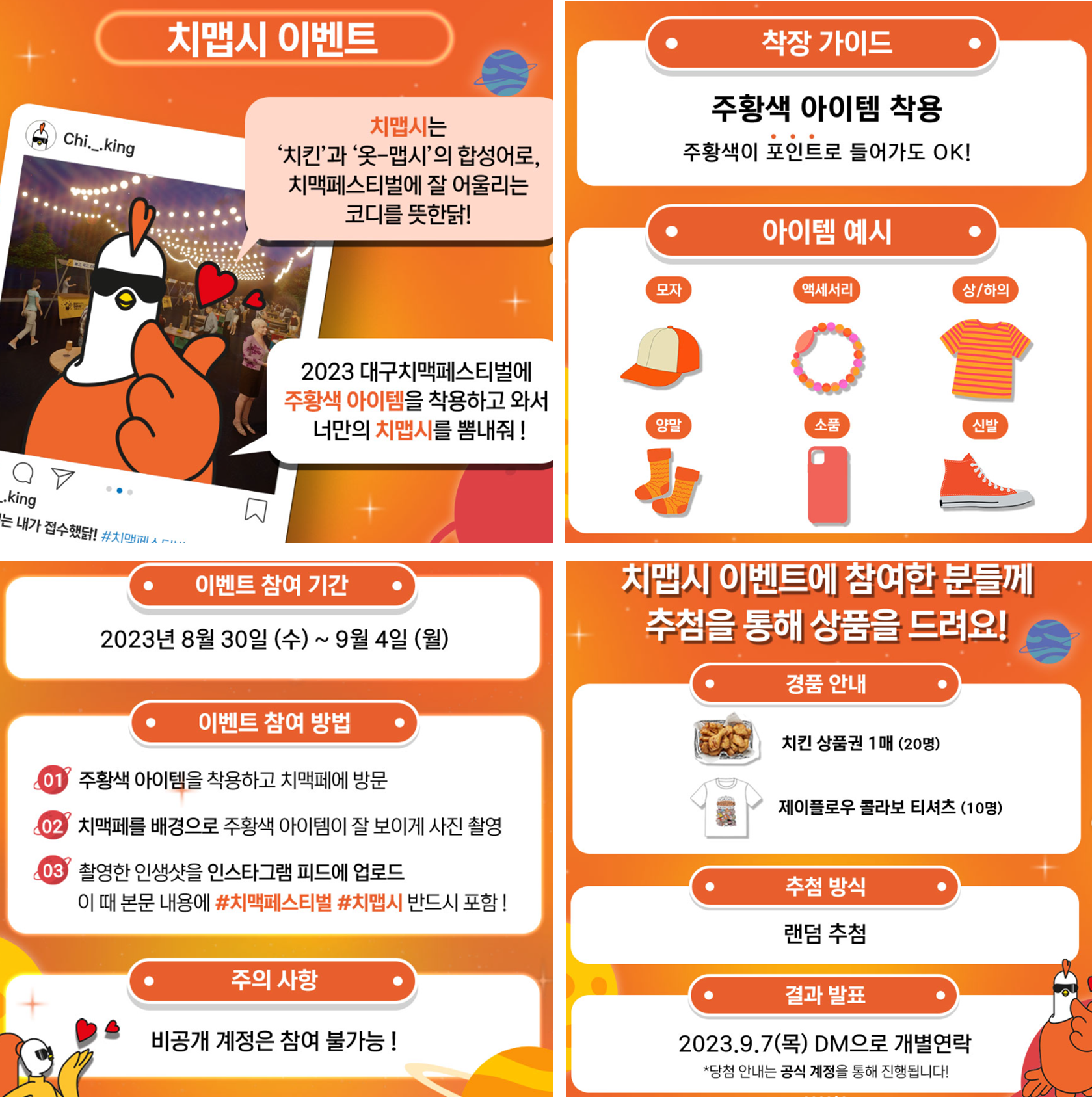치-하! 대구치맥페스티벌에 주황색 드레스 코드 이벤트가 생겼답니다. 치맵시는 ‘치킨’과 ‘옷-맵시’의 합성어로