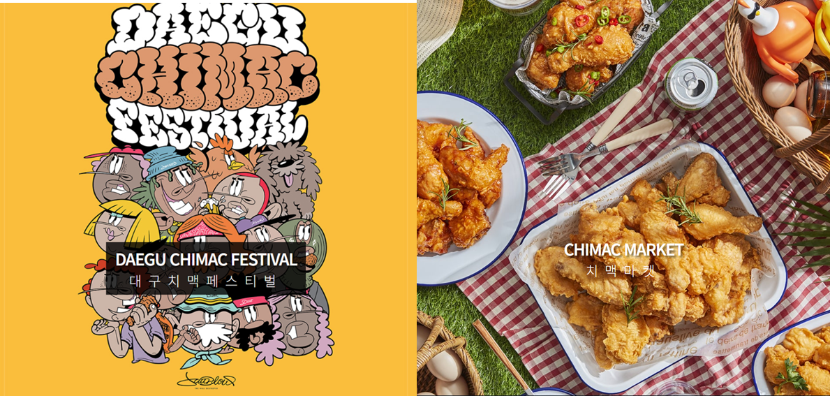 하늘이 내린 최고의 조합, 치킨과 맥주! 매년 여름, 대구에서 치킨과 맥주의 기막힌 조합을 테마로 한 대구치맥페스티벌이 열린다. 치맥페스티벌이라는 말 그대로 축제 기간 동안 맛있는 치킨과 시원한 맥주를 마음껏 즐기며 가수들의 공연을 관람할 수 있다. 유명 치킨프렌차이즈들이 참여하기 때문에 다양한 치킨을 한자리에서 골고루 맛볼 수 있는 절호의 기회이기도 하다. 시원한 얼음물에 발을 담그고 치맥을 즐길 수 있는 공간도 마련되어 있다. 유명 가수들의 축하공연과 DJ들의 신나는 EDM파티가 열리며, 밤 9시 9분에는 모두 함께 건배를 외치는 치맥 99 건배 타임이라는 재미있는 이벤트도 진행된다. (문화체육관광부)