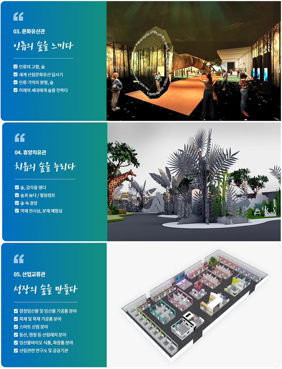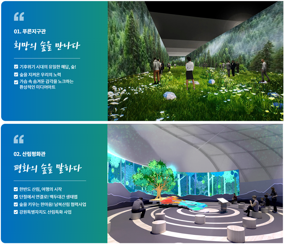 푸른지구관, 산림평화관, 문화유산관, 휴양치유관, 산업교류관 및 임업장비 야외전시장
